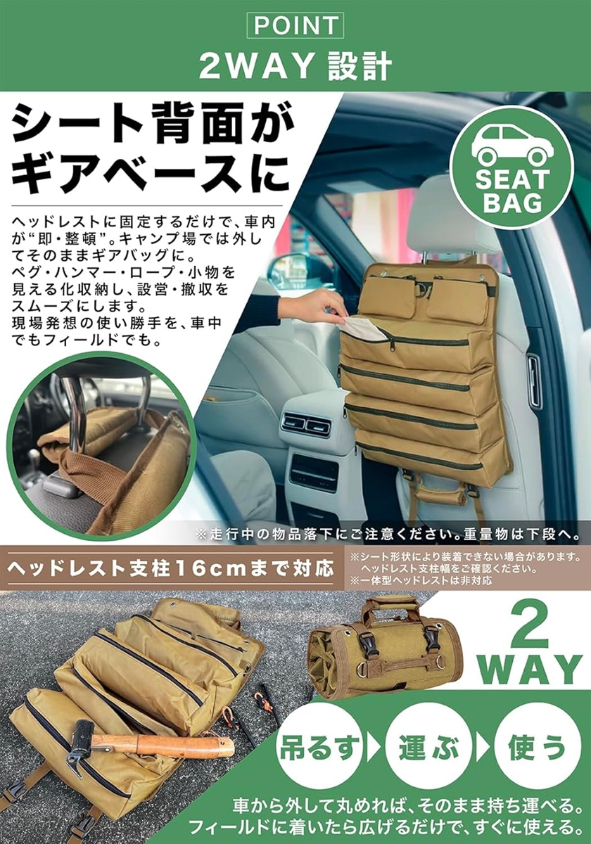 「2WAY設計」車のシートに掛けて整理、外せばそのまま持ち出せるギアバッグ ヘッドレストに固定するだけで車内が整理され、キャンプ場ではそのままギアバッグとして使用可能。