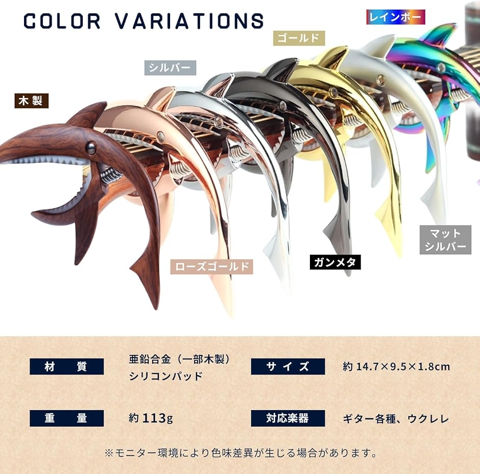 | 商品名 | ちゃんと固定ギター カポタスト ワンタッチ カポ サメ型 ウクレレ フォーク アコギ エレキ 亜鉛合金 木製 |