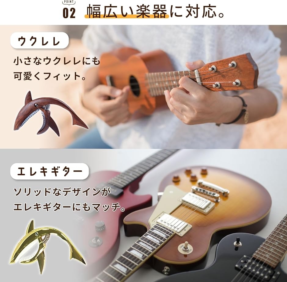 | 商品名 | ちゃんと固定ギター カポタスト ワンタッチ カポ サメ型 ウクレレ フォーク アコギ エレキ 亜鉛合金 木製 |