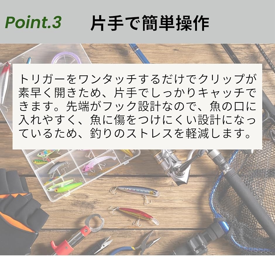 先端がフック設計なので、魚の口に入れやすく、魚に傷をつけにくい設計になっているため、釣りのストレスを軽減します。