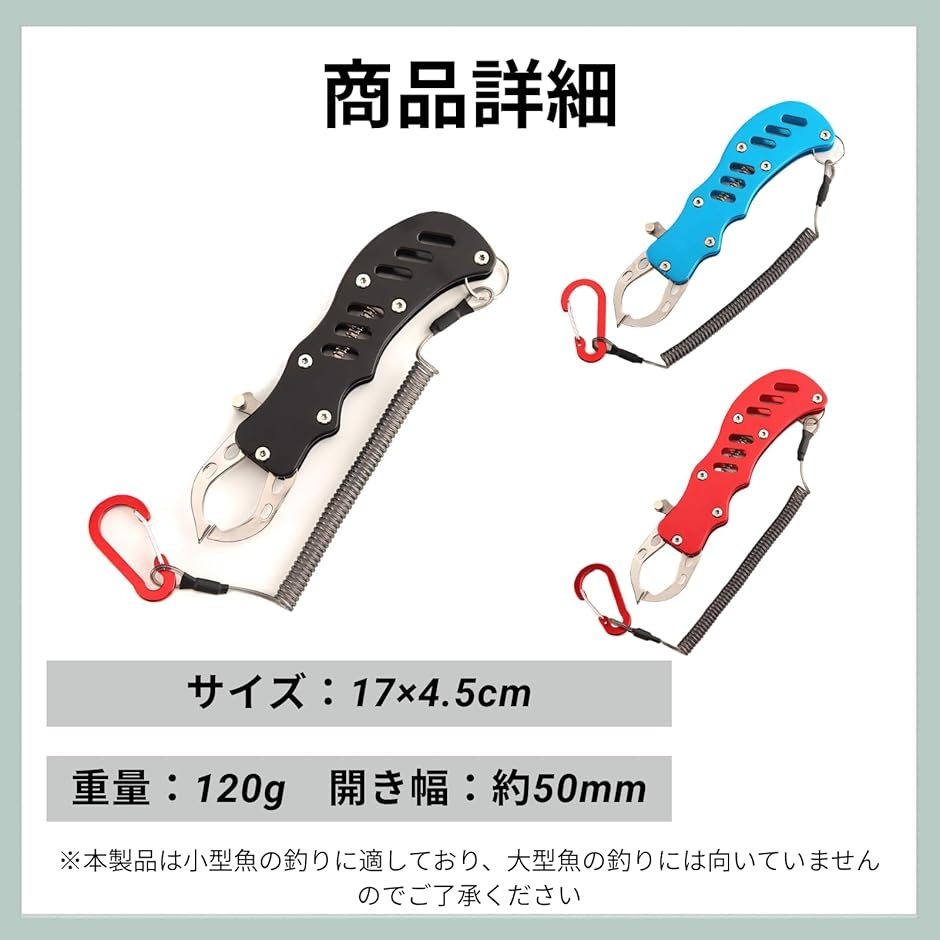 「商品詳細」サイズ:17x4.5cm 重量:120g 最大開き幅:約50mm *本製品は小型魚の釣りに適しており、大型魚の釣りには向いていませんのでご了承ください。