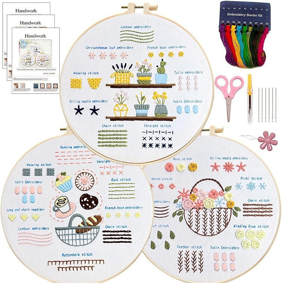「仕様」サイズ:20cmx20cm、セット内容:(1)20cm刺繍枠1個、(2)刺繍布3枚、(3)刺繍糸3パック、(4)刺繍針9本、(5)ハサミ、(6)糸通し、(7)シームリッパー、(8)マニュアル