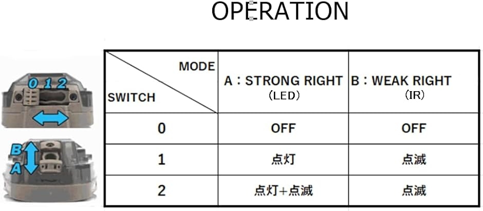 「操作方法」 〇0:OFF〇1:グリーンライト点灯〇2:グリーンライト点灯+ホワイトライト点滅〇メインスイッチ:IR/可視光切替 「仕様」〇ABS/ナイロン〇65g 「バッテリー」CR123Ax1個(別売) 「色」ブラック(本体)/ ブルー(ライト)