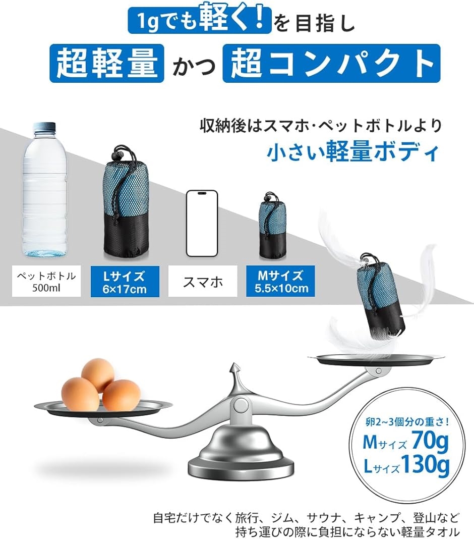 「1gでも軽く超軽量かつ超コンパクト」 Mサイズは約70g、Lサイズは約130gと卵2〜3個分の重さ自宅だけでなく、旅行、ジム、サウナ、キャンプ、登山など持ち運びに負担にならない軽量タオルを実現しました。