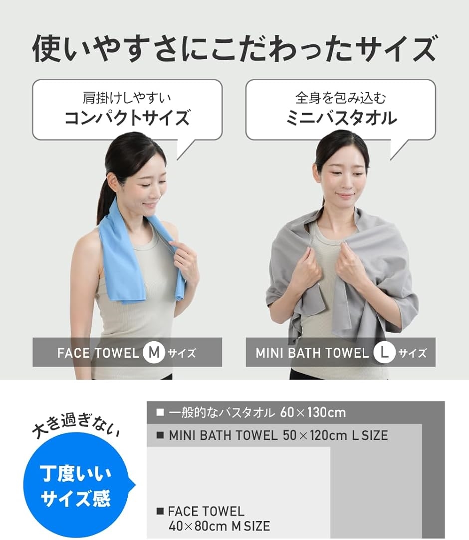 「使いやすさにこだわったサイズ」 Mサイズは40x80cmのフェイスタオルとして、Lサイズ 50x120cmのミニバスタオルとしてご使用いただけます。