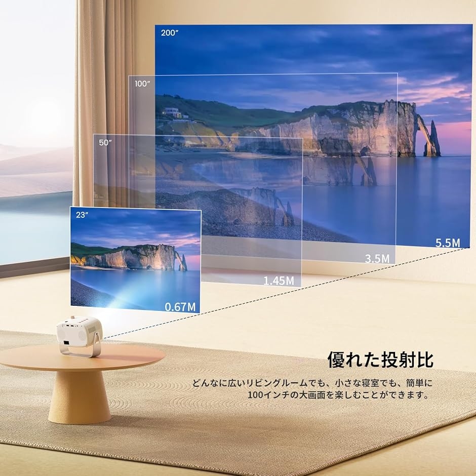 「3|短距離40〜300インチ投影|狭いワンルーム〜広いリビングまで対応」0.67mの短距離で約40インチ、最大300インチまで対応。