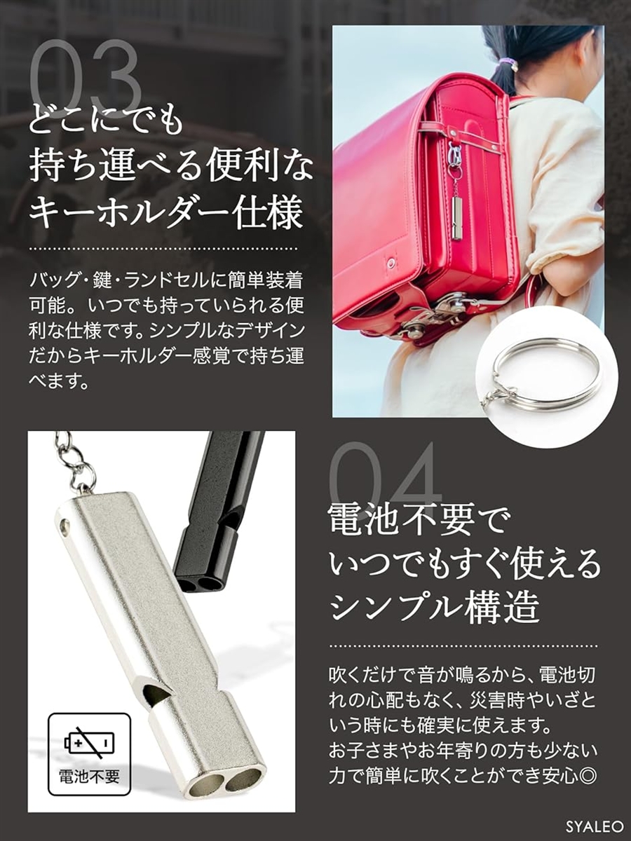 「電池不要シンプルな設計」吹くだけで音が鳴るシンプルな仕組みなので、電池切れや故障の心配がなく、いざという時にも確実に使うことができます。