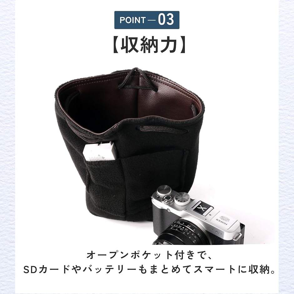 「機能性」厚手フリースがカメラやレンズを優しく包み、大切な機材をしっかり保護。