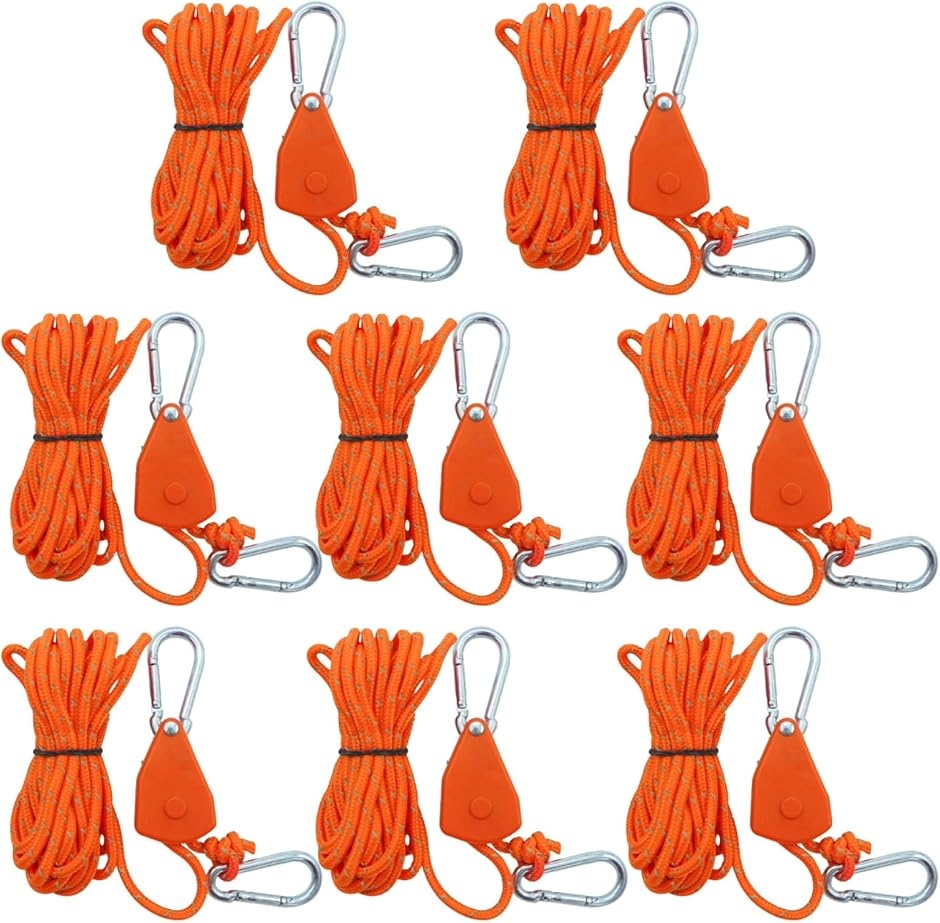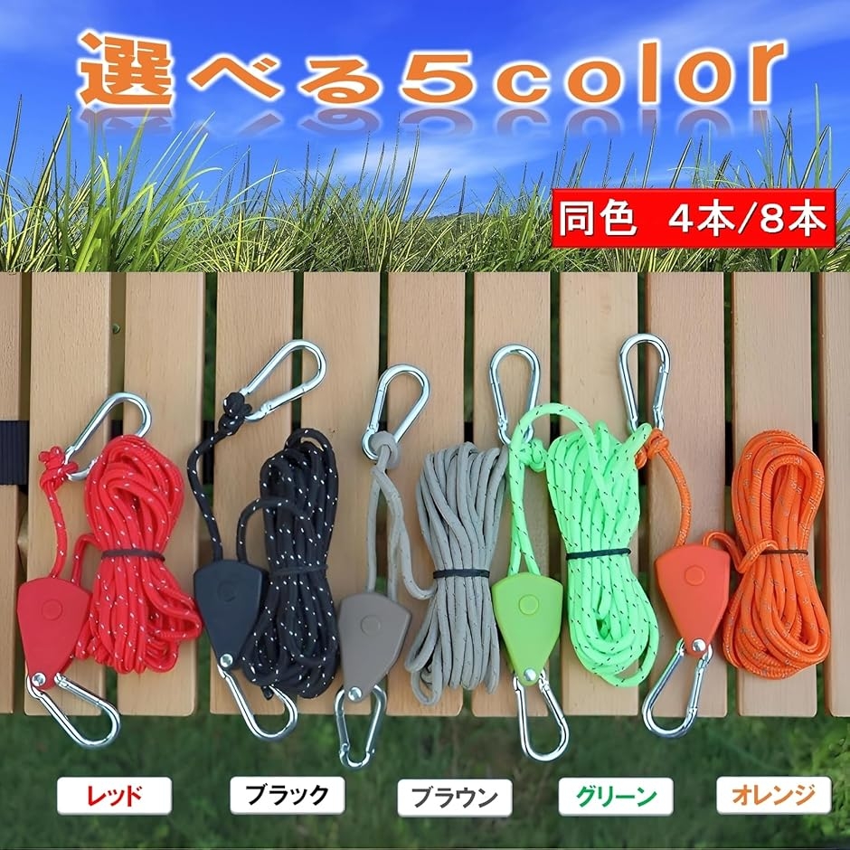「サイズ」長さ4M、ロープ太さ4mm、1/8「機能」カラビナ、ラチェット、パラコード(蛍光塗料)「色」ブラック、グリーンオレンジ、レッド、ブラウン「個数」8個セット*モニターの環境により、色の見え方に若干差が生じる場合がございます。