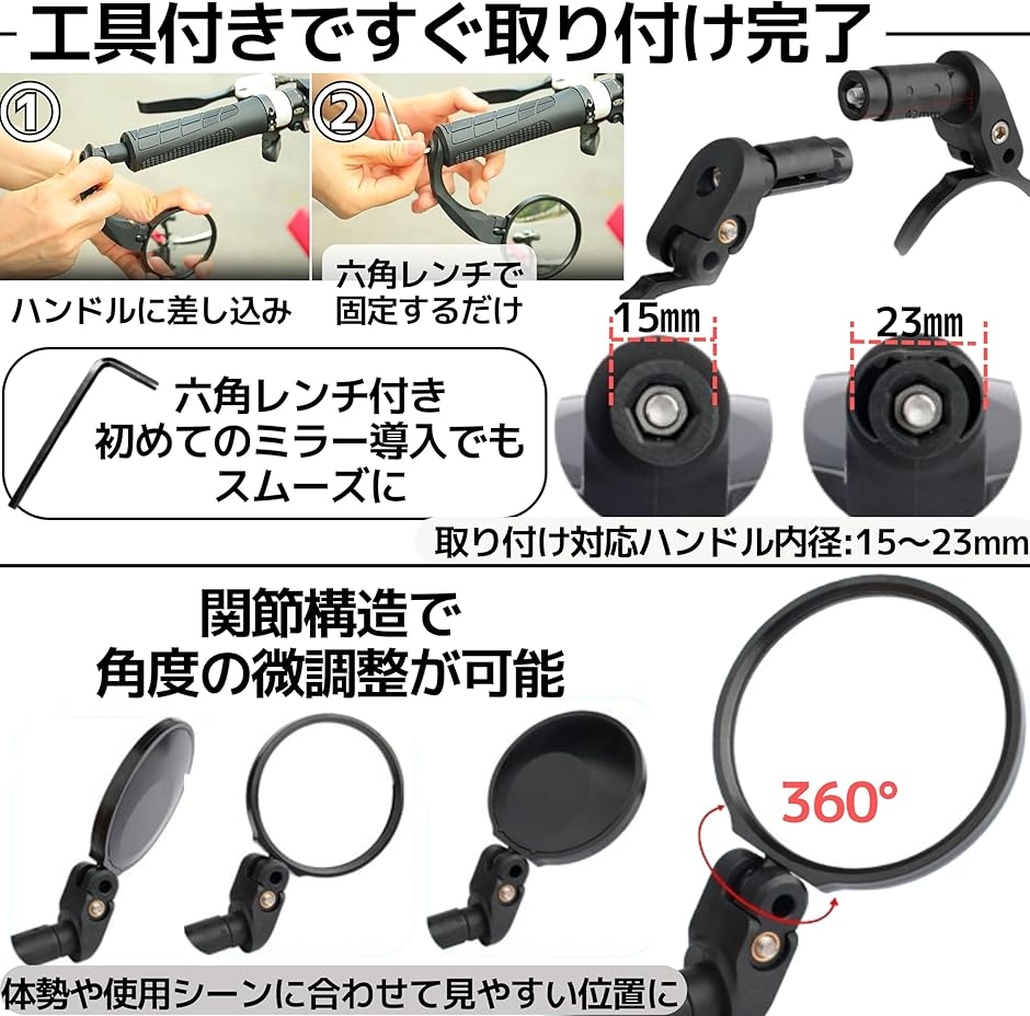 | 商品名 | 自転車 ミラー バーエンドミラー バックミラー 視認性アップ・角度微調整 取り付け簡単 六角レンチ付属 ロードバイク ママチャリ |
