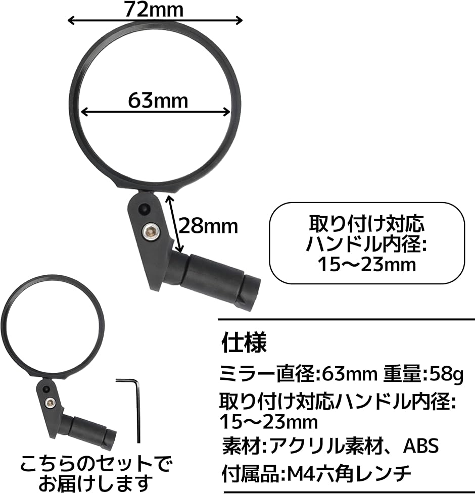「仕様」 サイズ:ミラー直径:63mm、重量58g、取り付け対応ハンドル内径:15〜23mm 取付方式:バーエンド差し込み固定 素材: アクリル素材、ABS 付属品:六角レンチ 対応目安:一般的なバーエンド付きハンドル(形状や内径により適合しない場合があります) 用途:ロードバイク/クロスバイク/シティサイクル等
