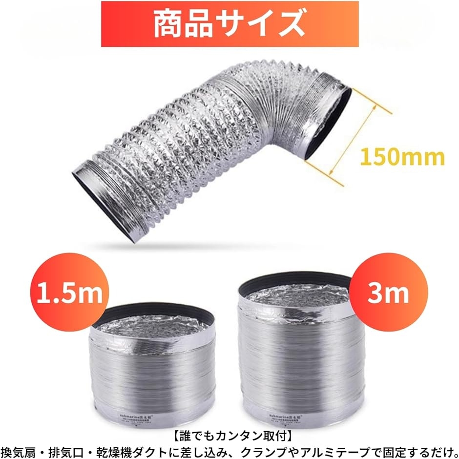「商品名」ダクトホース 「セット内容」本体x1、取付用アルミテープx1 「サイズ」直径150mm/長さ1.5m または 3m 「素材」二重アルミ箔、強化スチールワイヤー 「カラー」シルバー 「用途」レンジフード、換気扇、ガス乾燥機、エアコン排気、温室換気、工業用排気 など