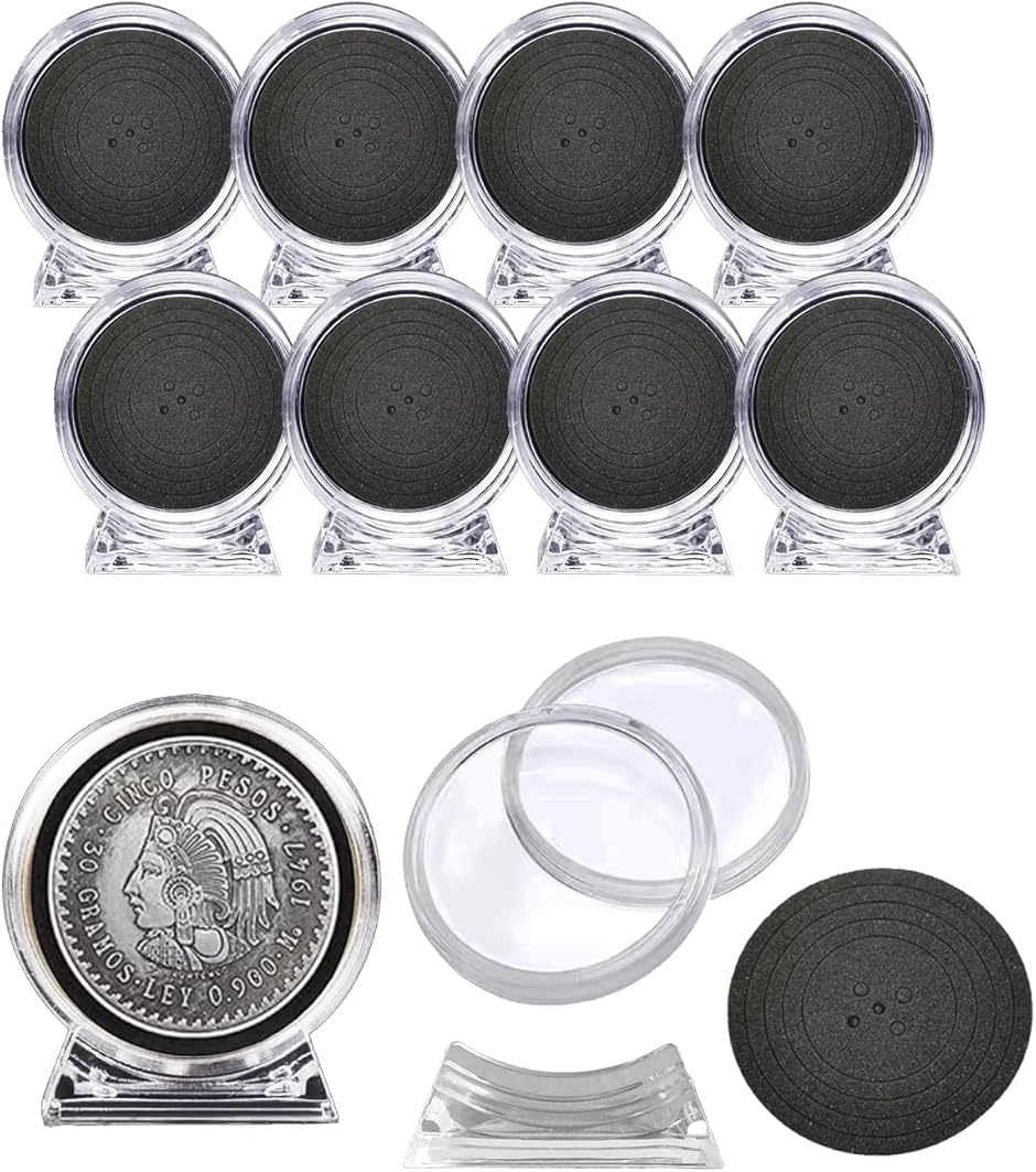 「サイズ」4.5x5.9x1.5cm(内径:4cm / 外径:4.5cm)「コインの適合サイズ」直径4cm以下「カラー」クリア、ブラック「材質」アクリル「セット内容」10個セット「付属内容」台座付き *コインは付属しておりません。