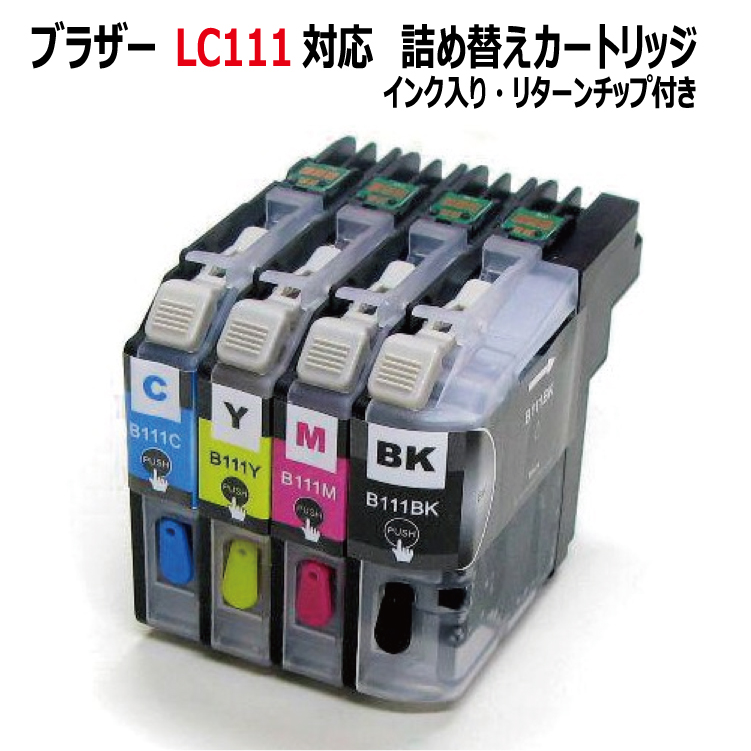 ブラザーLC111カートリッジ対応詰め替えインクカートリッジx4色セットです。 カートリッジはリターンICチップ搭載で、残量が自動で繰り返し満タンに戻ることにより、詰め替えが可能になりました。(リセッター不要) カートリッジはインク補充口があり、フタを取ってチューっと注入するだけ、10秒チャージ、超簡単です。カートリッジはスケルトンでインクの量が見た目で残量が分かります。インクが無くなったら別売のリピートインク(インクボトルのみ)を使う事によって大幅コスト削減可能、経済的です。 繰り返し再生、省資源で環境にやさしく、経費削減可能な経済的な製品です。 インク液も純正同様、黒は顔料インク、カラーは染料インクで弊社こだわりのインク採用。黒はにじみにくく普通紙印刷も大変きれいに印刷できます。 ※事前に報告なく仕様、パッケージ等を変更する場合があります。ご了承ください。◆メール便
