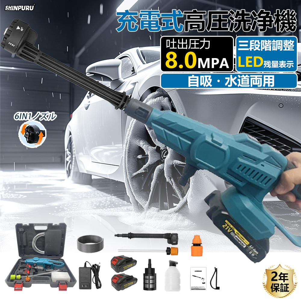 6-in-1多機能延長ノズル付き、0°/15°/25°/40°/シャワー/ストレートの六つ水噴射モードがある、使用シーンに合わせて選択できてとても便利です。3段階水?調節できる8MPaほどの吐出圧力、大掃除や洗車に便利な高圧洗浄機です(水圧がある程度高いと、汚れも落ちやすくなるので、8MPa以上のモデルお勧めします)コケなど頑固な汚れ、ベランダや網戸、ドアサッシ、室外掃除、お風呂や室内掃除などカンタンに掃除できます。 【収納ケース付き】コードレス洗浄機なので洗浄機本体と各種の部品を全部収納できる専用ケースを搭載されます。使わない時にスッキリと収納できるだけでなく、室外や洗車場所へお持ち運びも便利です。