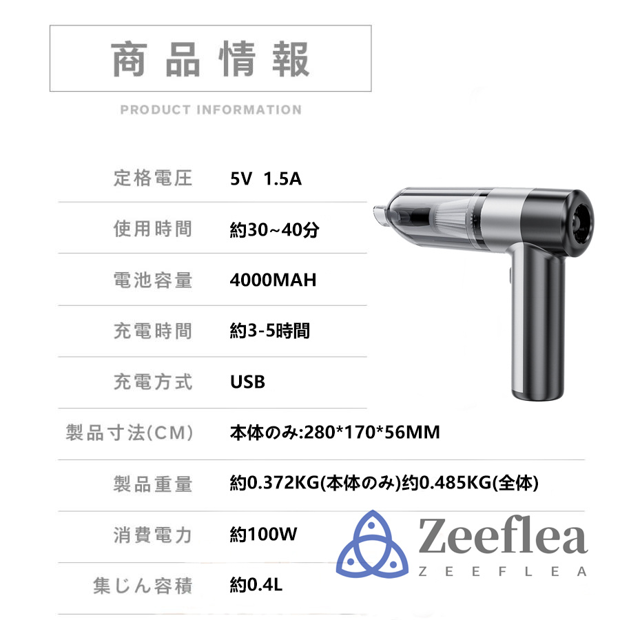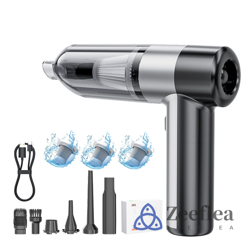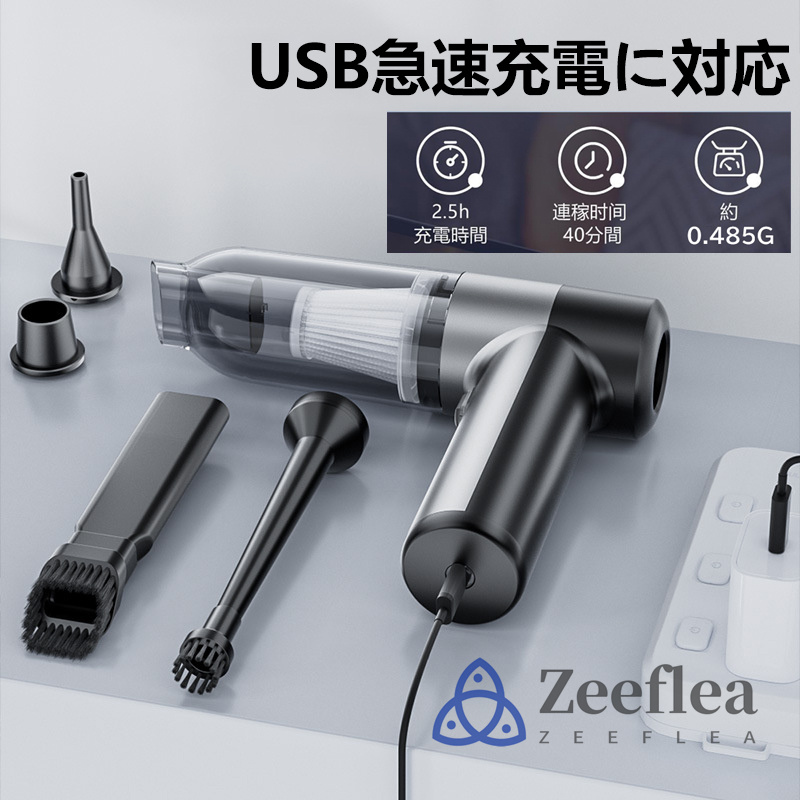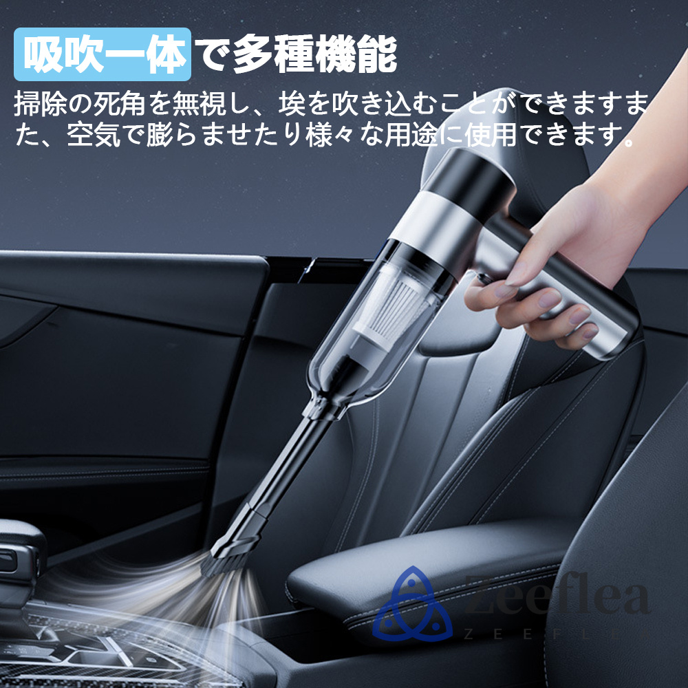 【充電式小型掃除機】コードレスカー掃除機は、強力な6000mAhの充電式バッテリーを搭載しており、便利なUSB充電に対応しています。