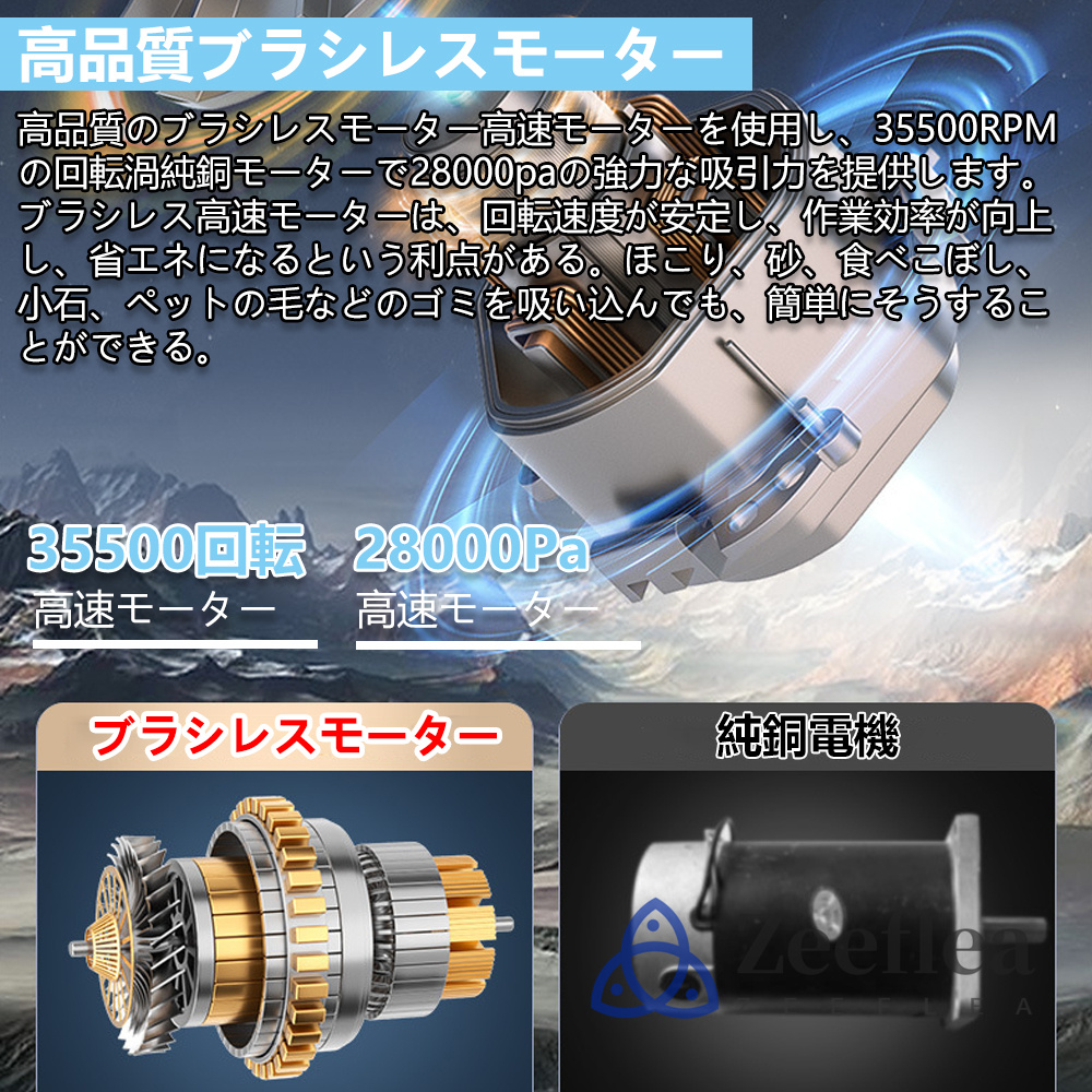 【ディープクリーン用の強力なモーター】ハンドヘルド掃除機コードレスは、11,000Paの吸引力と75,000rpmのブラシレスモーターを誇り、効率的な掃除を実現します。