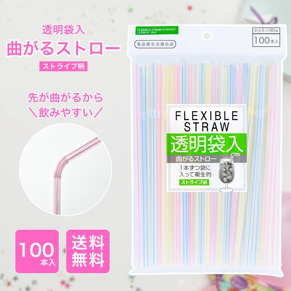 ストロー 曲がる ストライプ 100本入 5×190mm 個包装 透明袋入 食品衛生法適合 使い捨てストロー