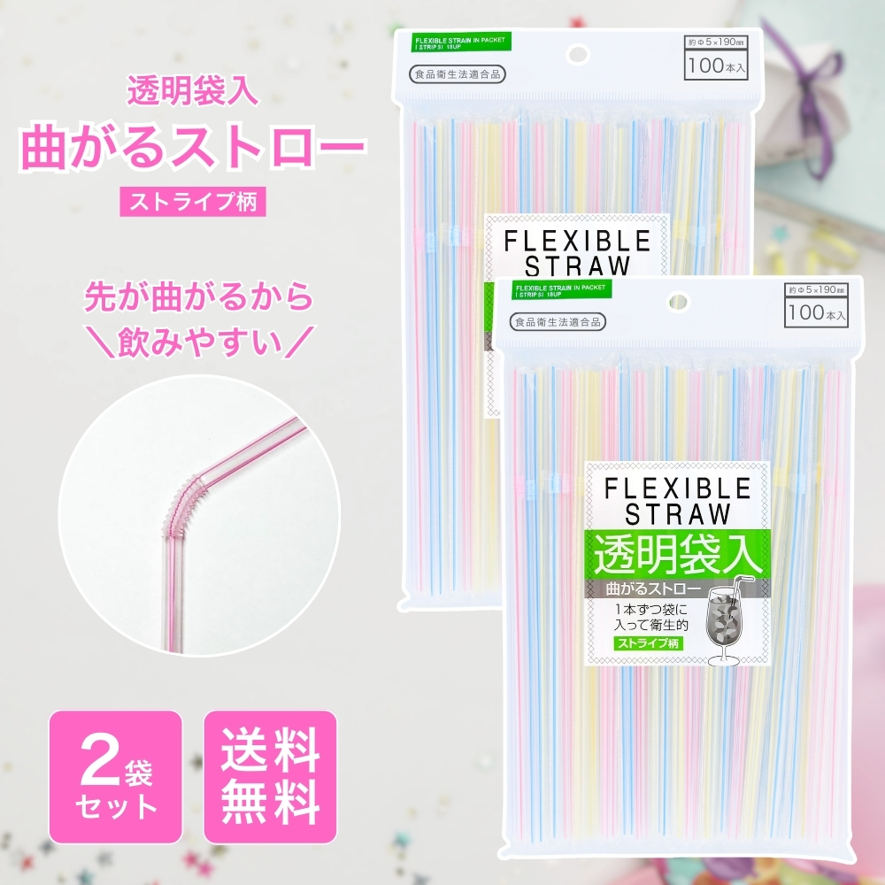 ストロー 曲がる ストライプ 100本入 2セット 5×190mm 個包装 透明袋入 食品衛生法適合 使い捨てストロー