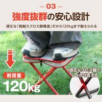 安定感と安心の耐久性:広げると23×26×26cmのしっかりした座面が展開。耐久性に優れたカーボンスチール製のフレームと、厚手で丈夫なオックスフォード生地を採用することで、最大120kgの耐荷重を実現しました。座り心地の良さと頑丈さを両立しています。