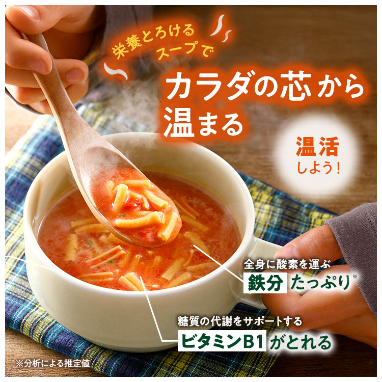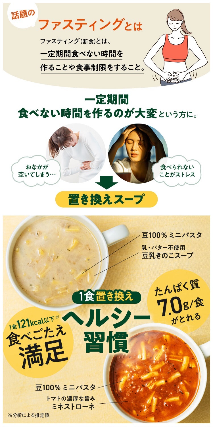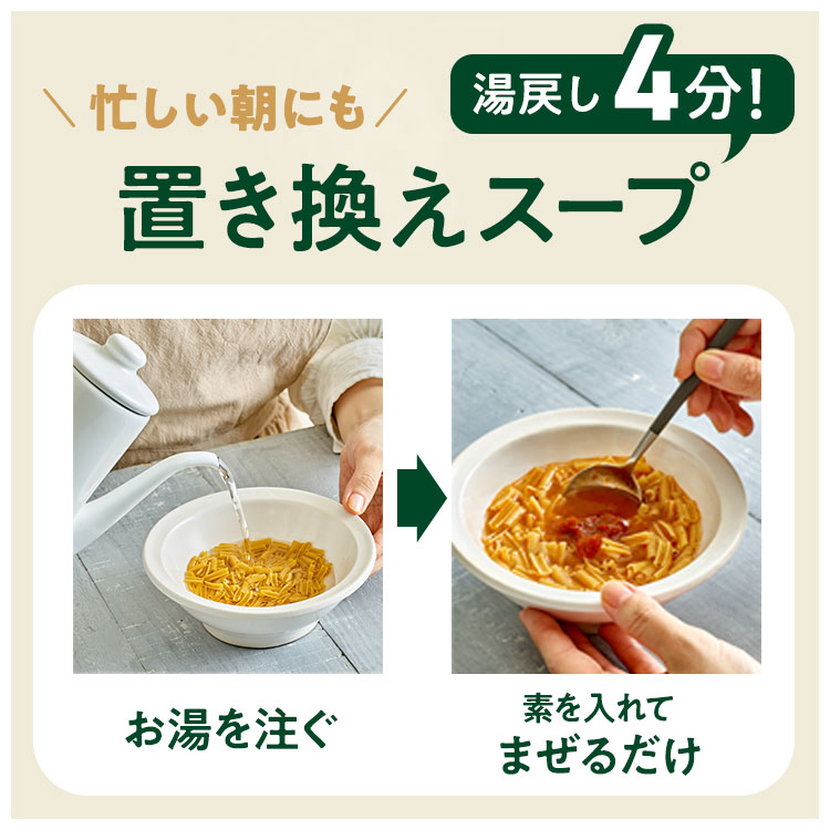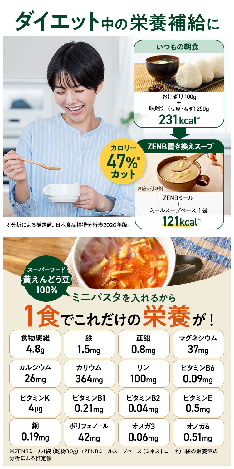 | この商品について | 【置き換えスープ】 ファスティング ではなく、ダイエット 中でも食べたいを我慢したくない方に。1食121kcal以下、いつもの朝ごはんより糖質61%OFF*3、市販スープ春雨よりも食物繊維8.6倍*4。 *おにぎり100g、味噌汁250gとZENBミール乾物30g(戻し後100g)+ミールスープベース ミネストローネ17gと比較して * 2024年他社売上上位品平均値との比較にて(分析値による推定値)、喫食時1食あたり日本食品標準成分表2020年版、分析による推定値、ZENBミール+ZENBミールスープベース 1食あたりの糖質量:16.31g