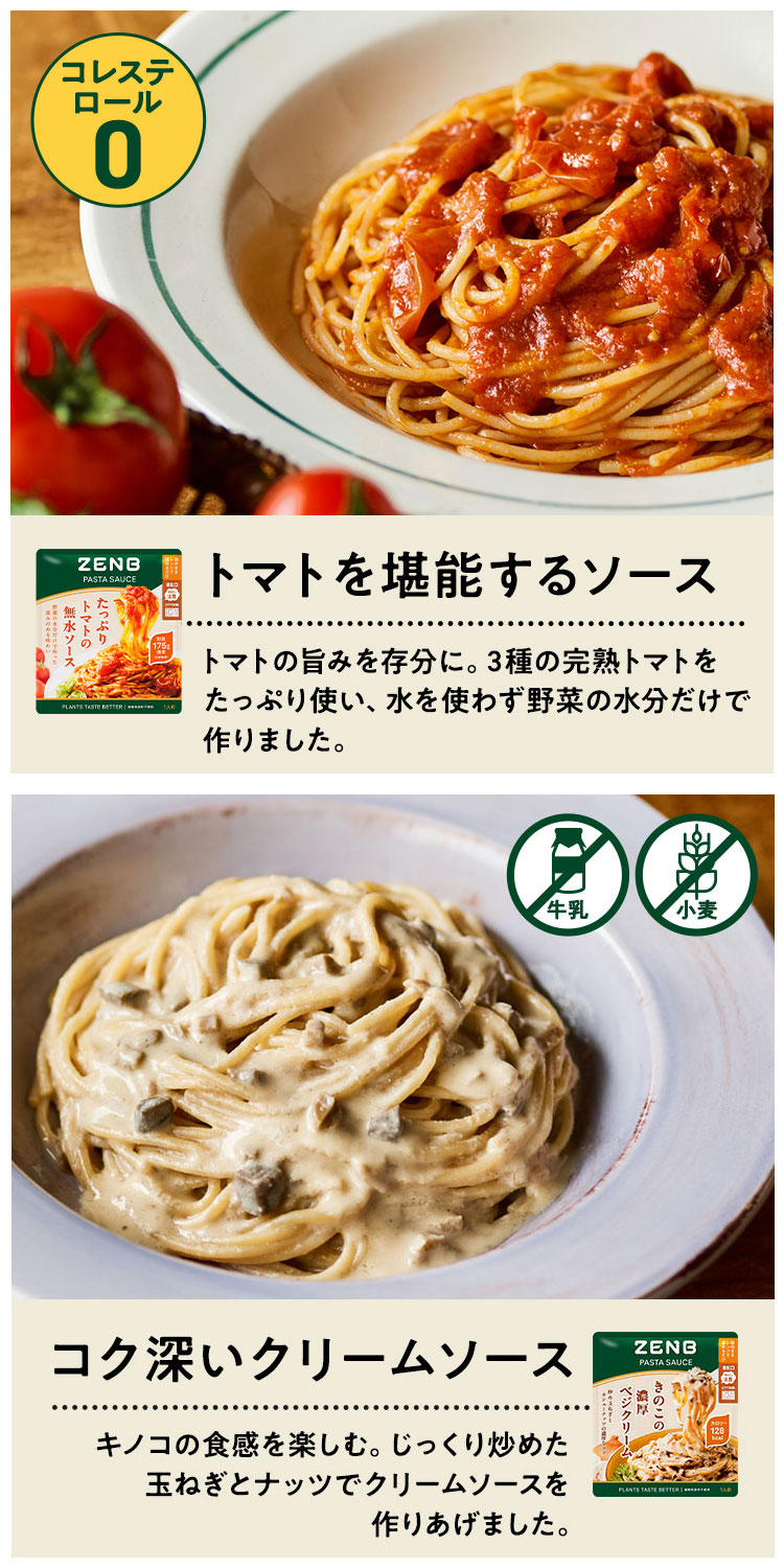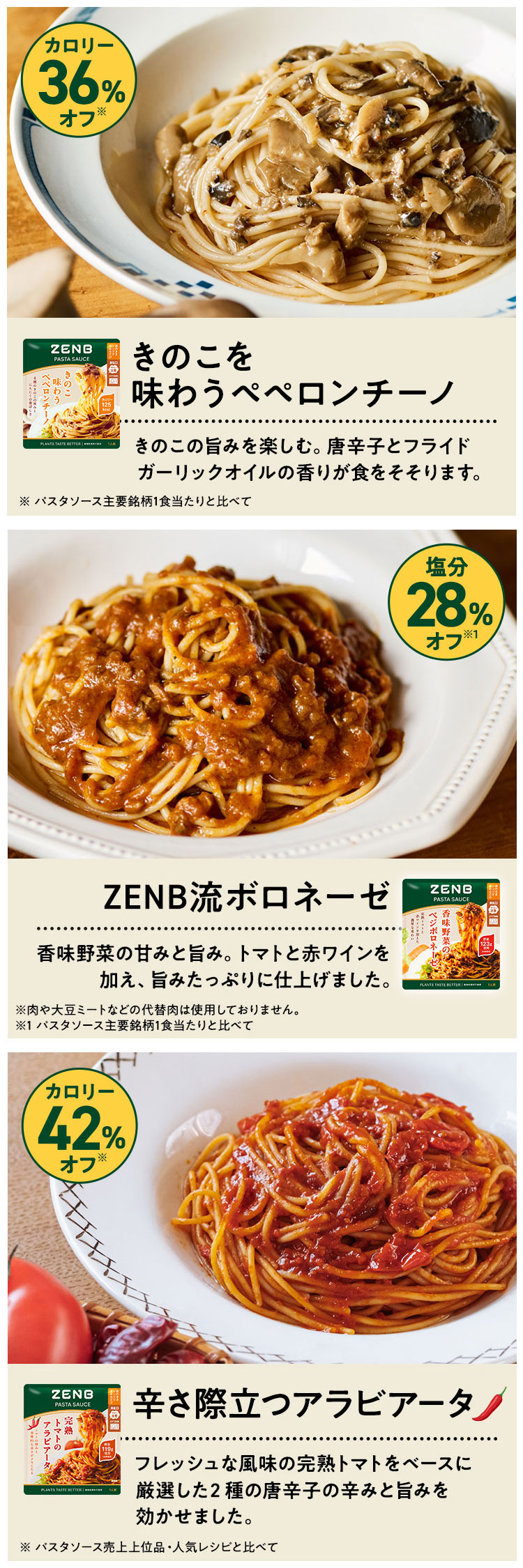 *1 日本食品標準成分表2020年版(八訂)喫食時1人前あたり(調理前重量 精白米66g、ZENBヌードル80g) *2 1日当たりの摂取量は「日本人の食事摂取基準(2020年版)」の「18-64歳の男性・女性」の値を用いています。 パスタソースは全5種類:おいしさを追及したこだわりの厳選素材を使用。さらに嬉しいグルテンフリー |