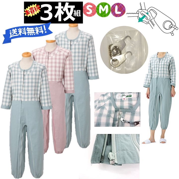 【平日15時まで即日出荷】制菌介護用つなぎ フルオープン S/M/L 3枚セット【パジャマ おむついじり 認知症 いたずら防止】