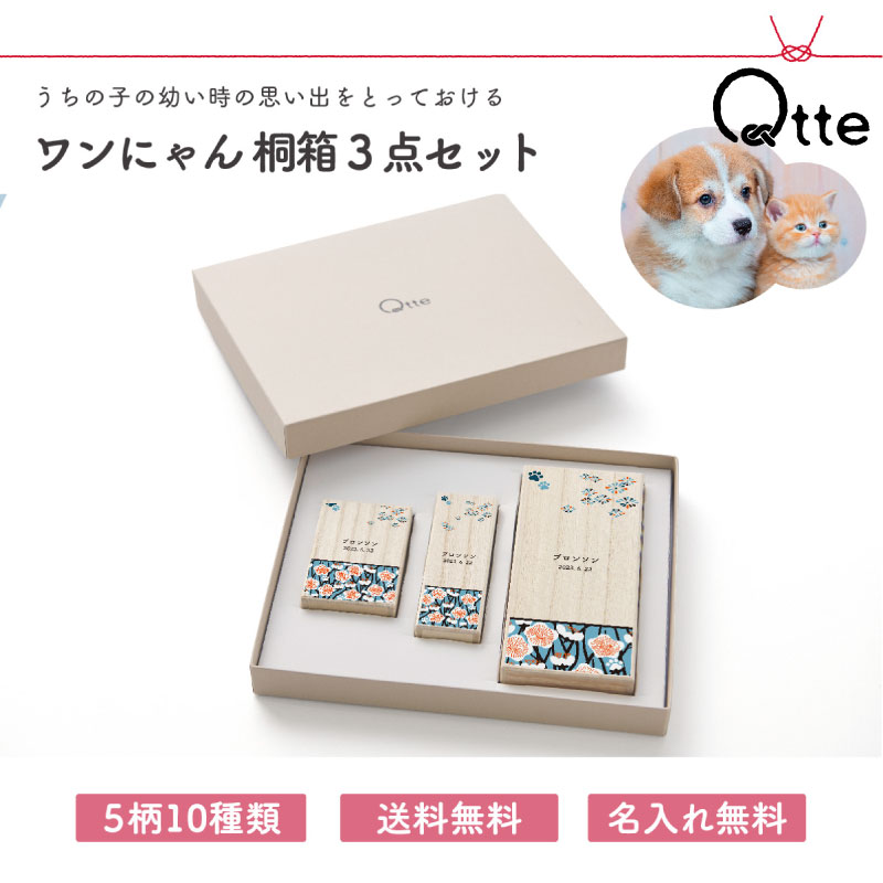 送料無料 名入れ無料 ワンにゃん桐箱3点セット Qtte ペット 名前入り 犬用 猫用 メモリアル 祈り 願い おしゃれ かわいい おヒゲ 乳歯 モフモフ入れ