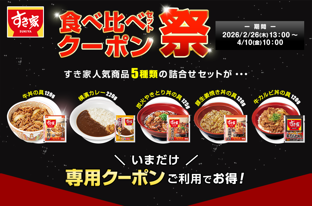 すき家「牛丼の具120g」「牛カルビ丼の具120g」「豚生姜焼き丼の具120g」「炭火やきとり丼の具125g」「横濱カレー220g」がそれぞれ4食ずつ、合計5種20食入りのセットです。
