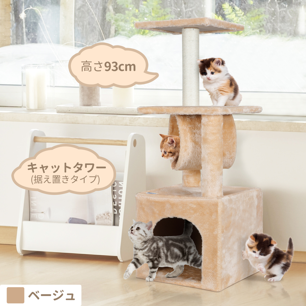 僅少「セール価格」キャットタワー 省スペース 猫タワー 据え置きタイプ 猫用 ペット 猫ハウス 安定性抜群 天然サイザル麻紐 爪とぎ柱 高さ93cm