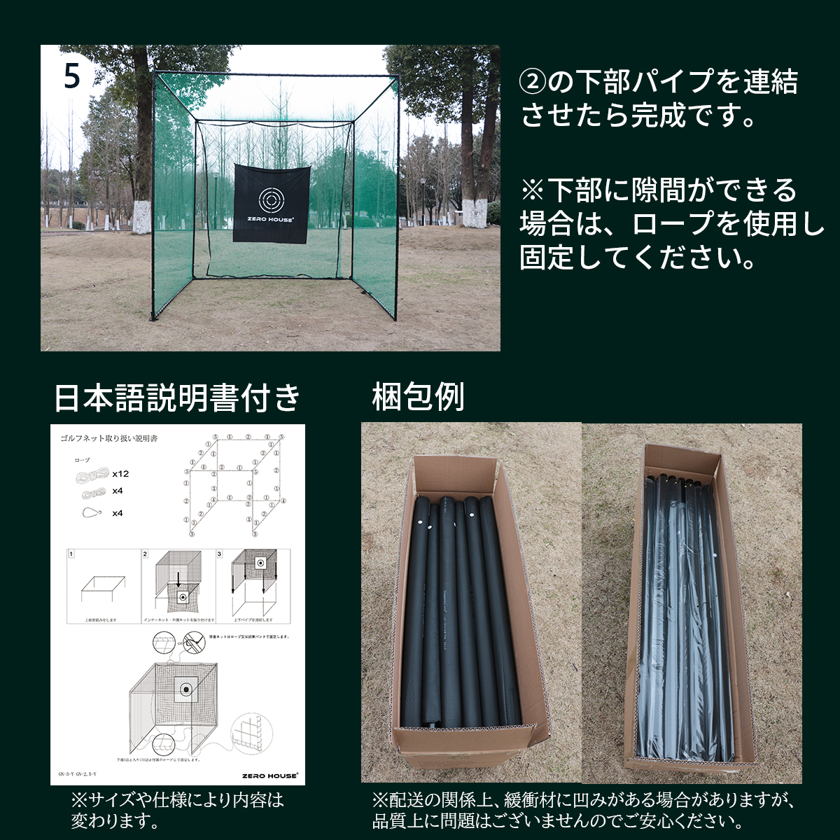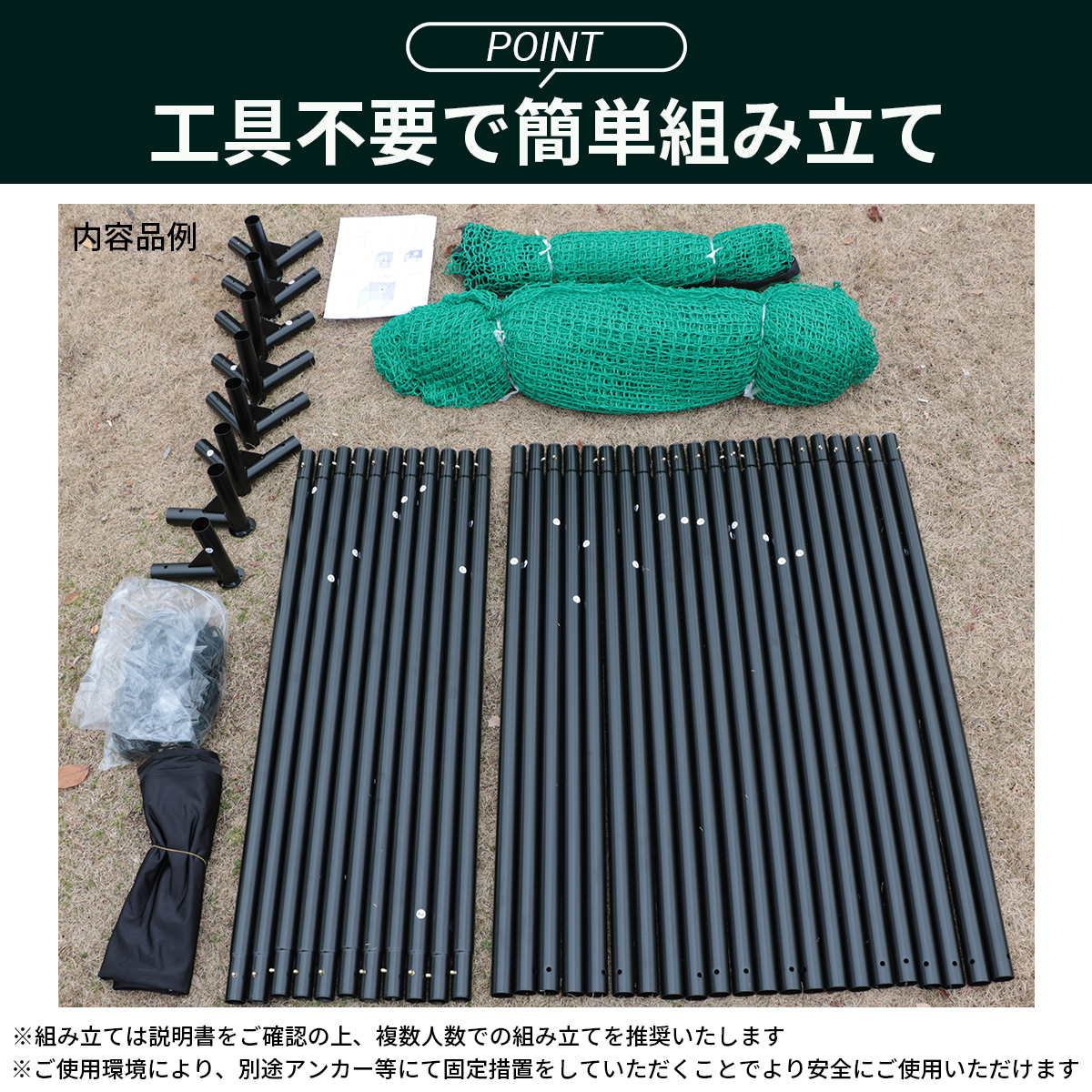 ・パイプ及びジョイント(土台含む)・ネット・前面用2重ネット・ターゲット・ネット固定用紐※仕様により本数内容が異なります・組み立て説明書