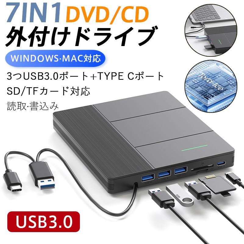 DVDドライブ 外付け ケーブル内蔵 Window Mac OS対応 USB 3.0 vista MacBook Air 静音 高速 超軽量 書き込み対応 読み込み対応 オフィス 学校 通学 通勤 外付けdvdドライブ レコーダー 外付け光学 ドライブ CD-RW DVD-RW スリム パソコン DVD プレイヤー ドッキングステーション 7ポート