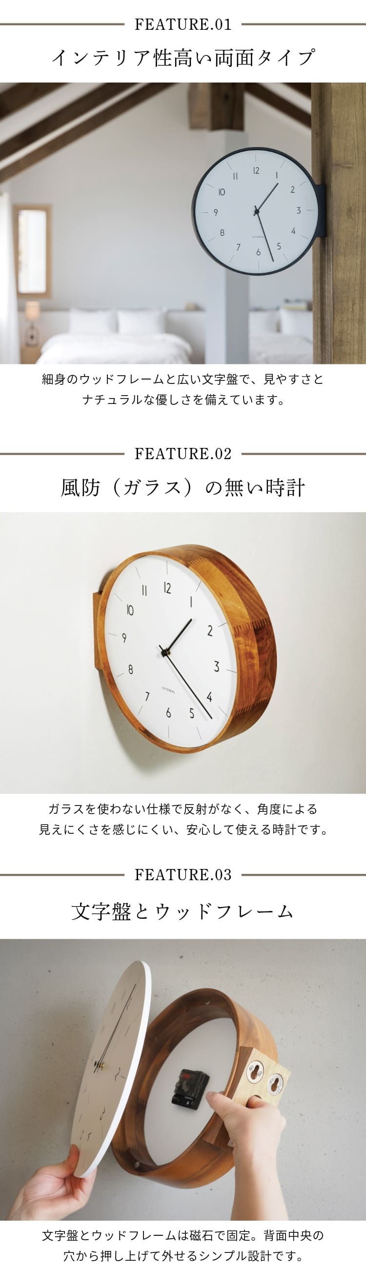 「暮らしに馴染む」をコンセプトにスタートした両面時計がようやく完成しました。木目の美しさが特徴のウッドフレームからは素材のぬくもりだけでなく、職人の手仕事が見て、触れて、感じられます。視認性を高めるため、文字盤デザインを広くしています。程よい存在感で空間にフィットするサイズ感にもこだわりました。