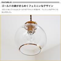 丸いガラスセードの縁にあしらったゴールドのラインがフェミニンな装いのペンダントライト。