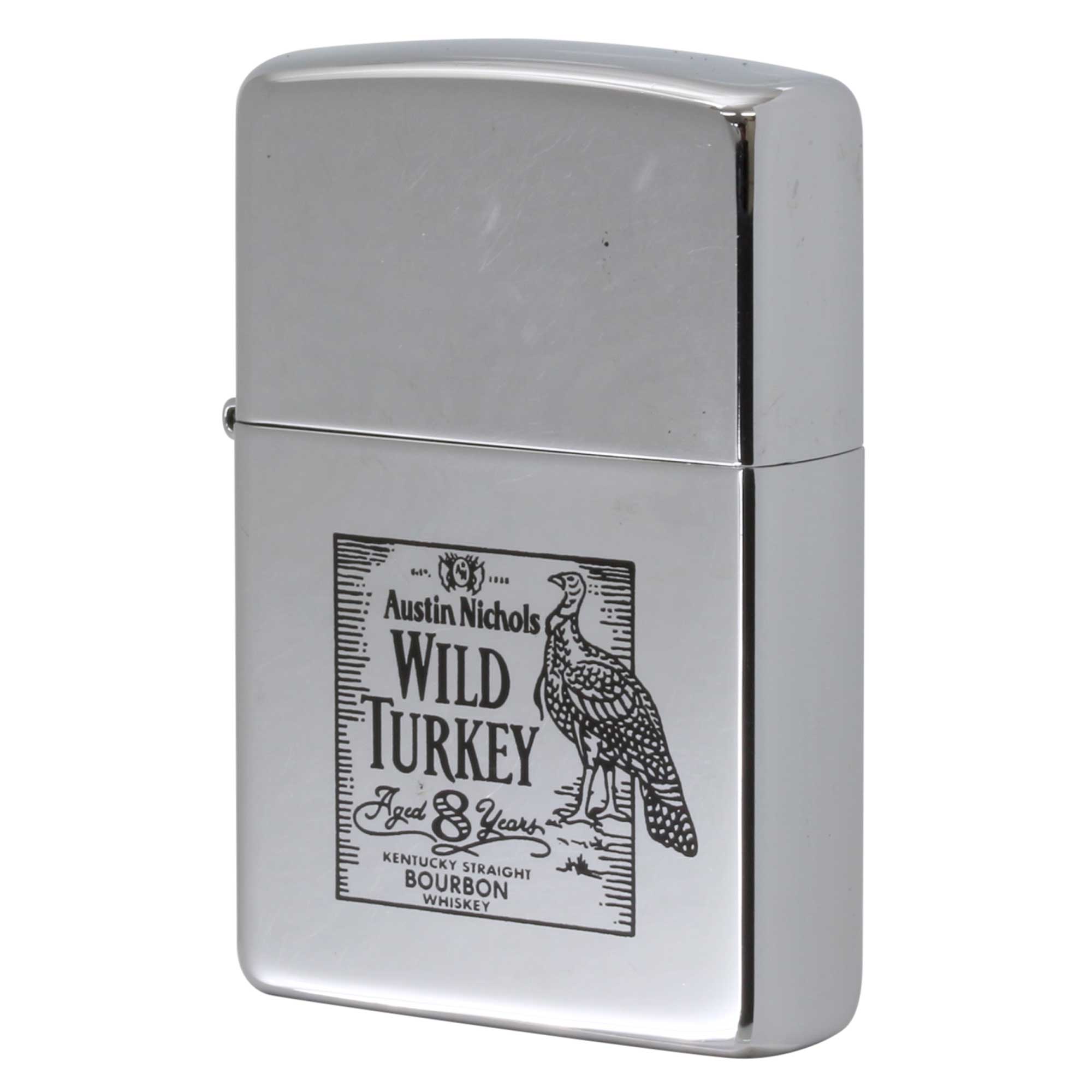 アメリカのバーボン・ウイスキーでお馴染みの「WILD TURKEY」のZippo。ワイルドターキーは、アメリカ合衆国ケンタッキー州に由来するバーボン・ウイスキーの銘柄です。「ワイルドターキー 8年」のラベルデザイン柄です。クロムメッキ、エッチング、色入れ。