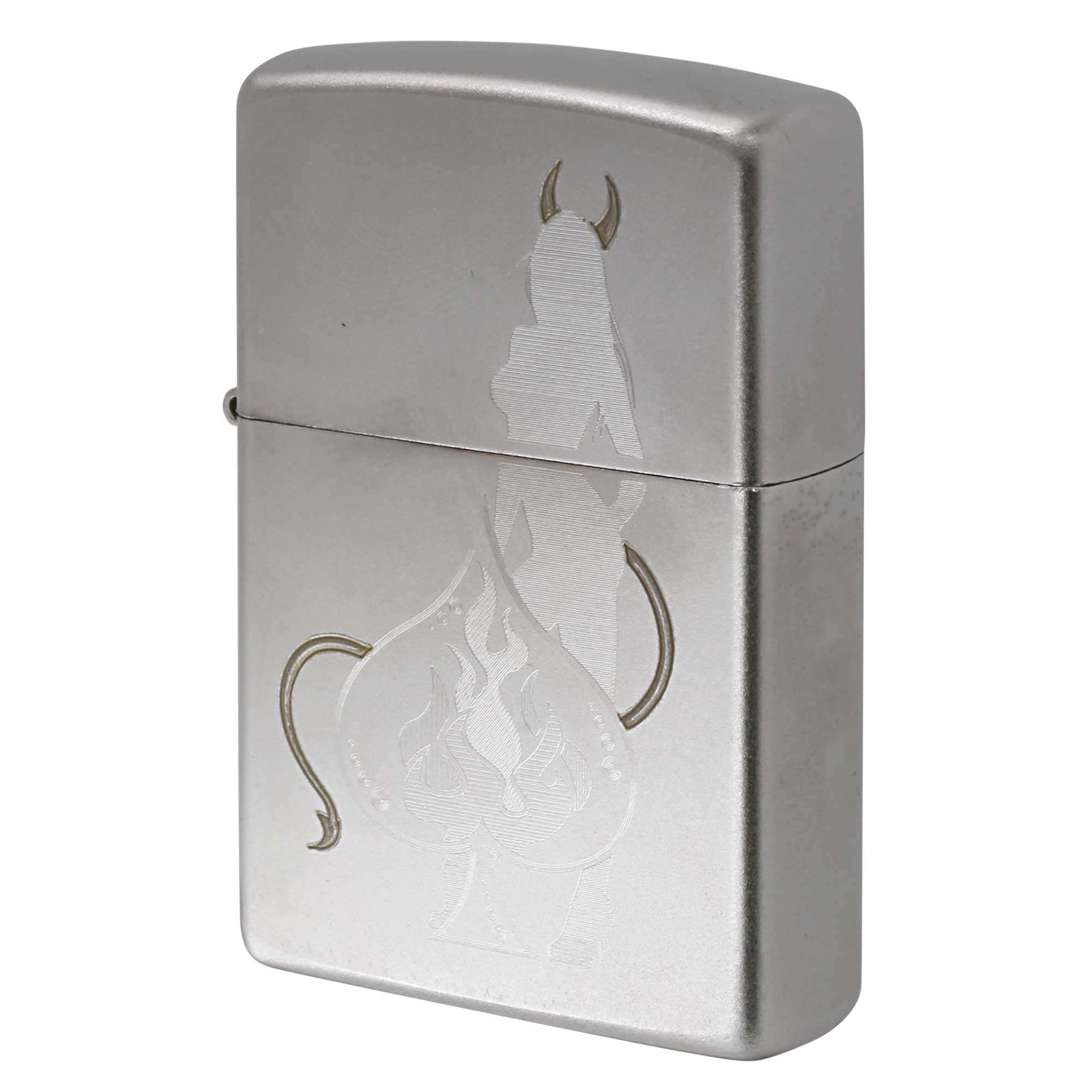 スペードのマークとセクシーな小悪魔のような女性が描かれたZipoo。オートツートン加工によって彫刻され。金と銀のコントラストがおしゃれ。サテンクローム仕上げ。