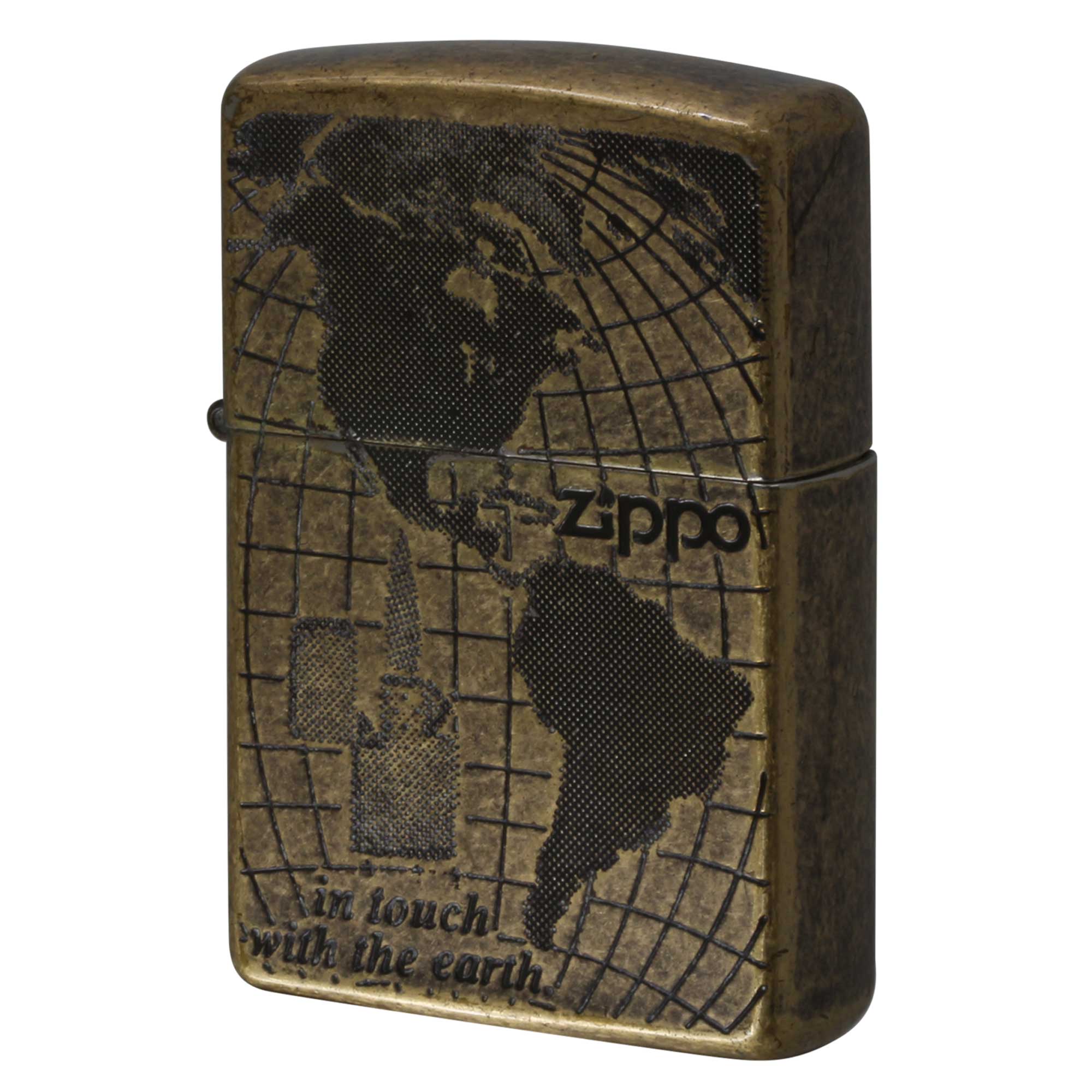「in touch with the earth」(大地とつながる)。地球儀とZIPPO、壮大なスケール感のZIPPOです。201FBベース、エッチング、色入れ。