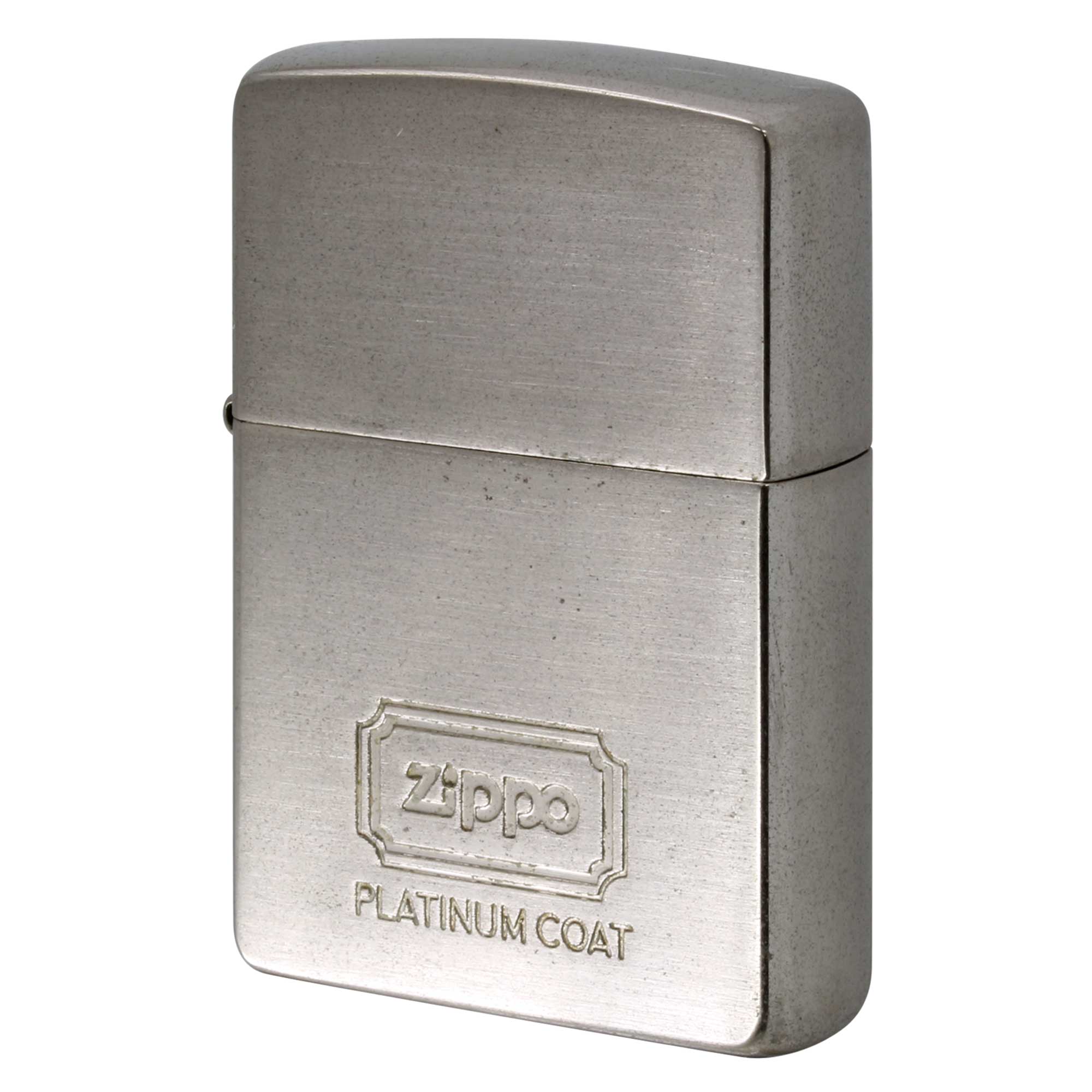 美しい輝きが魅力のプラチナコーティングZIPPO。ロゴマークと、プラチナコーティングの刻印。プラチナコーティング、サテン仕上げ、エッチング。