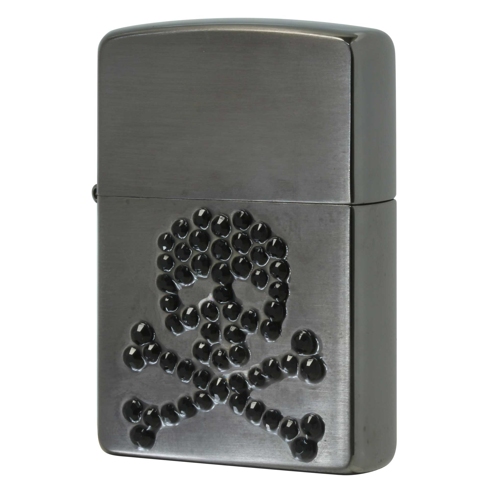 ZIPPOでは定番のスカル柄。ケースボトム中央にラインストーンでスカルのデザイン。ブラスニッケルメッキサテン仕上げ。シンプルで普段使いにオススメ!