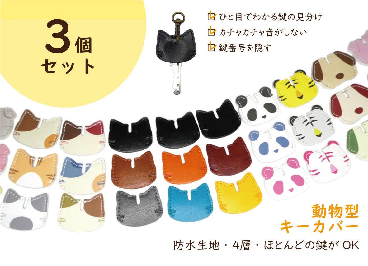 3個セット 動物型 キャップ キーカバー 鍵 合鍵 キー セコム 防犯 SNS 合皮 革 のような かわいい アニマル ネコ 猫 キャット パンダ 虎 タイガー ブタ 犬