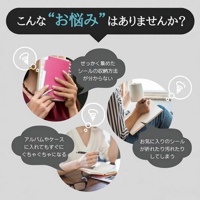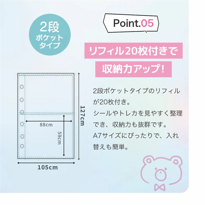 2段ポケットタイプのリフィルが10枚付属しており、収納力は抜群です。シールやカードをスッキリ整理でき、入れ替えも簡単。自分好みにカスタマイズ可能です。
