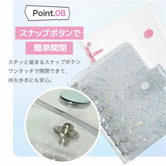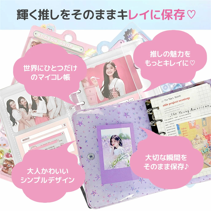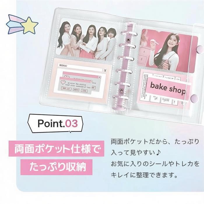 このバインダーは、シールもトレカもたくさん収納できる両面ポケット仕様です。見やすく整理できるので、推し活やコレクション整理に最適です。お気に入りのアイテムをいつでもキレイに保管できます。