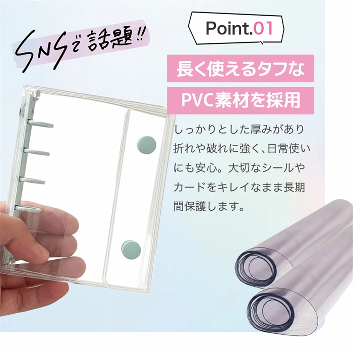 大切なシールやトレカをしっかりと保護するために、厚みのある丈夫なPVCカバーを採用しました。折れや汚れに強く、透明感が高いクリアデザインで中身を美しく引き立てます。