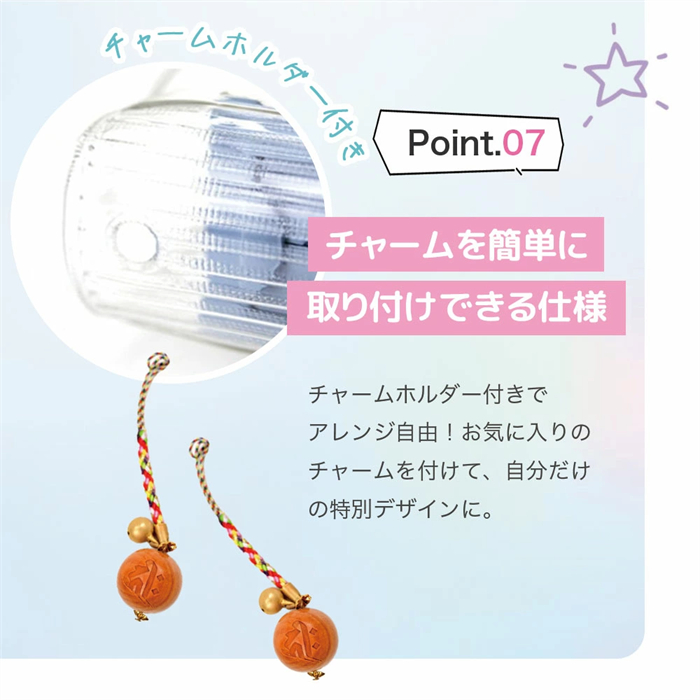 ワンタッチで開閉できるスナップボタン付きで、持ち歩きも安心です。さらに、チャームホルダーが付いているので、お気に入りのチャームを付けて自分だけの特別なデザインに仕上げることができます。