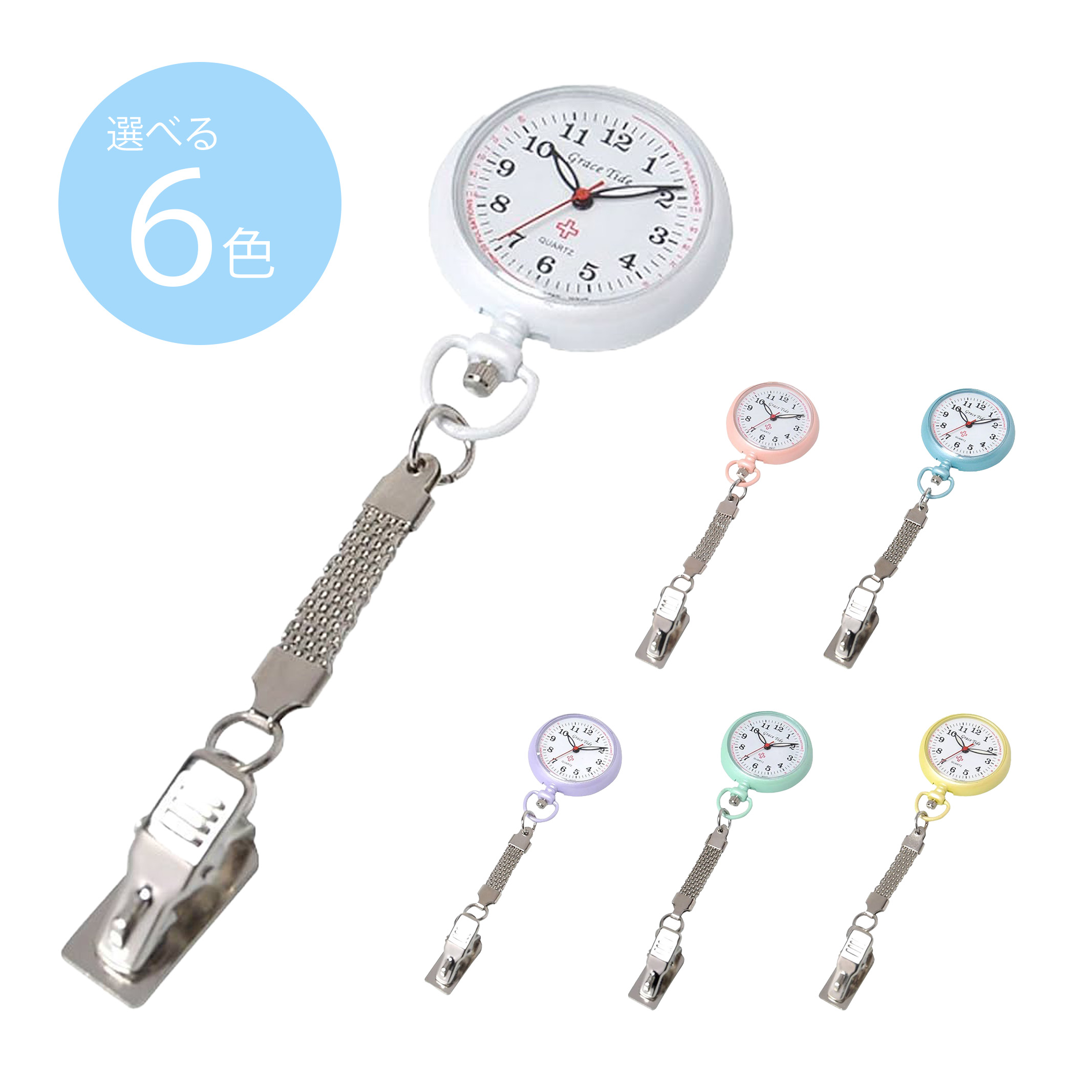 JANコード:4944109308154 / 4944109308147 / 4944109308185 / 4944109308130 / 4944109308161 / 4944109308178ホワイト/ピンク/パープル/ブルー/ミント/イエロー文字盤が見やすいクリップタイプのナースウォッチです。・クリップ付きで、胸ポケットや鞄などに簡単に取り付けることができます。・医療・看護の場で働く方はもちろん、金属アレルギーで腕時計が苦手な方にもおすすめです。・スッキリとシンプルなデザインも人気。暗いところで光る蓄光タイプです。・脈拍計測目盛付き。チェーンの長さ:約70mm文字盤サイズ:Φ33×7mm全長:約103mm