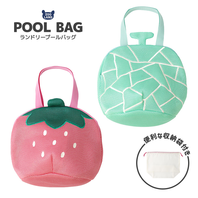 キッズ プールバッグ そのまま洗える 収納ポーチ付き 2点セット メッシュバッグ ランドリーバッグ スイミング いちご イチゴ 苺 メロン フルーツ 洗濯ネット