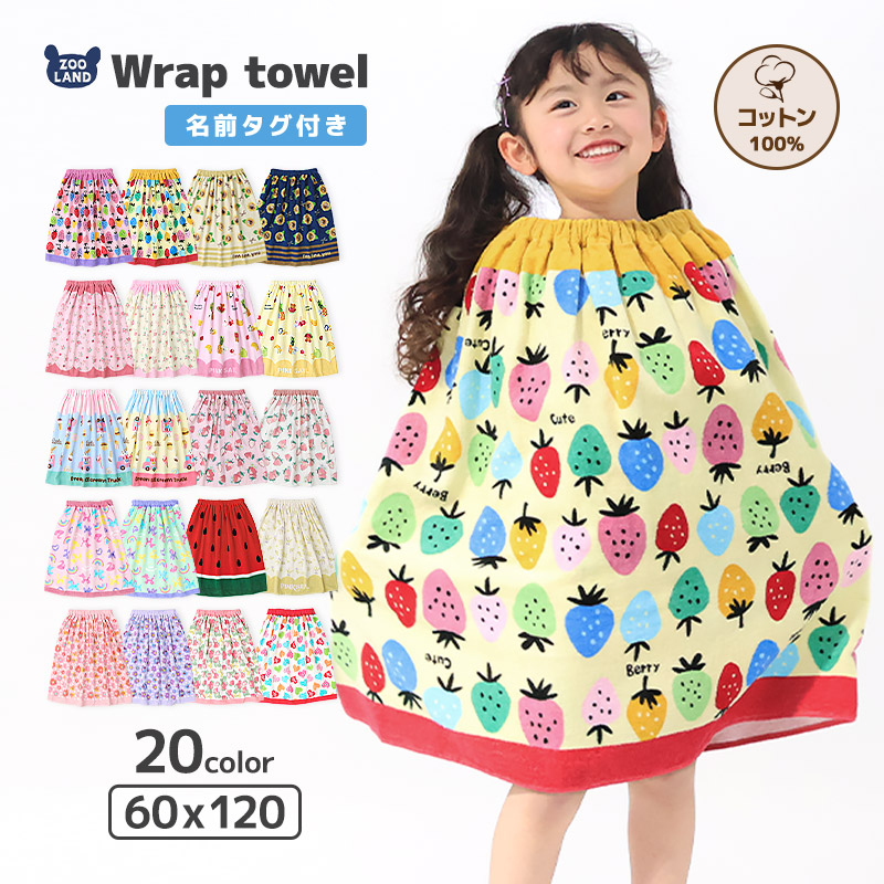 | SPEC | | 商品番号 | 302019 | | 商品説明 | 大人気ラップタオル おかげさまで、販売枚数81万枚突破! 皆様からご愛顧いただきまして 累計販売枚数が810,000枚を突破しました。 タオルの中でお着替えができる 便利なラップタオル。 学校やプールやレジャーで大活躍します。 簡単に頭からすっぽりかぶれますので お風呂上りに寒さ対策としても活用できます。 スナップボタンで開け閉めできるから お子様でも簡単に使えて ラップタオル以外でも、一枚物のタオルとして使用ができます。 ちょっとした移動など 冷え対策や日焼け防止にも役立つ多機能タオルです。 60cm丈シリーズは、 身長110cmくらいまでのお子様では、首からかぶってご使用いただけます。 身長120cm以上のお子様は、腰回りに巻いてご使用いただけます。 ■素材 お肌に優しい天然素材の綿100% やさしいカットパイルのふわふわ生地で肌触りが良く 吸水性にも優れています。 ■最適な厚み 生地は、厚すぎないのでお洗濯後の乾燥も早く 最適な厚みです。 ■ウエストサイズ調節機能 ゴム入りでボタンを留める位置で、 ウエストサイズを2段階に調節可能です。 ■取っ手タブ付き 取っ手としてタブを付けて お子様がひとりでも開け閉めしやすいように つかいみやすい仕様です。 引っ掛けておくこともできるので便利です。 ■お名前タグ付き お名前タグが裏側についていますので、 間違える心配やなくす心配が減ります。 ■オリジナルデザイン トレンドやお子様の好きな柄を 弊社デザイナーが企画したオリジナルデザイン。 選べるカラーバリエーション A:フラワー/ピンク A:フラワー/ラベンダー B:かき氷/ピンク B:かき氷/パープル C:おおきなイチゴ/ピンク C:おおきなイチゴ/ホワイト D:バルーンアート/ピンク D:バルーンアート/ミント E:レモン/イエロー E:レモン/ミント F:チェリー/ピンク F:チェリー/レッド G:くだもの/スイカ G:くだもの/レモン H:ストロベリー/ピンク H:ストロベリー/レッド I:スイカ/ピンク I:スイカ/クリーム J:ハート/ピンク J:ハート/ホワイト 是非お気に入りの1枚を見つけてください。 ■水着トータルコーディネート 同デザインの水着やプールバックなども取り揃えがございます。 まとめてトータル購入や、ご兄弟姉妹でリンクコーデなどもおすすめです。 ■ギフト 洋服と違って着用サイズが広いので、 お子様へのプレゼントなどにも最適です。