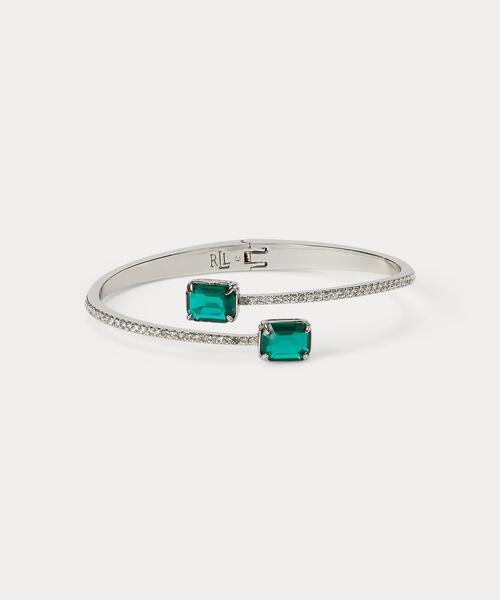 ロジウムメッキ加工を施したブラスで洗練されたシルエットに仕上げたヒンジバングル。パヴェセットのクリスタルと輝く模造石2つの装飾付き。内側にあしらった”LRL”の刻印入りロゴで、さりげないシグネチャーの仕上がりをプラス。