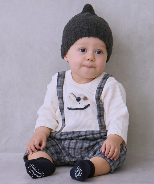 サスペンダーをつけているようなデザインは、一枚着るだけでコーデが完成。