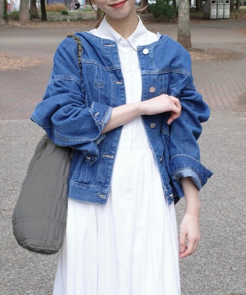 参考商品名:襟元スッキリとしたバランス良いアウター。ノーカラーデニムジャケット
